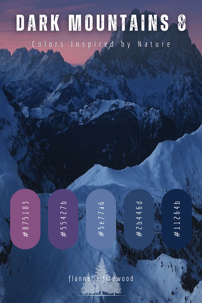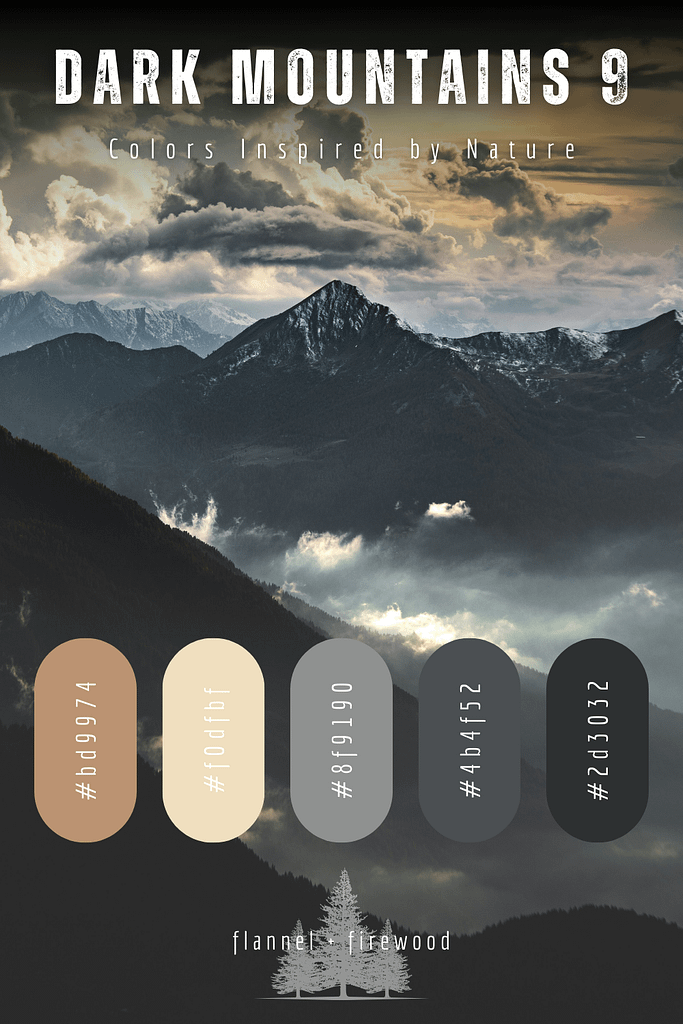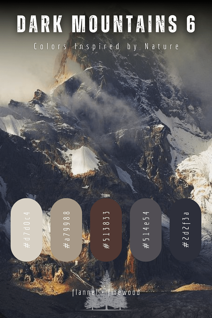 The Dark Mountains Collection color palette draws its inspiration from the awe-inspiring mystery of majestic mountain landscapes. As twilight deepens into night, this palette captures the grandeur of towering peaks with its deep, intense hues. Midnight blue and obsidian black form the foundation, mirroring the mountains’ imposing silhouettes against a starlit sky. These colors not only evoke a sense of strength but also encapsulate the timeless allure of the mountains. With these hues, the palette conveys the enigmatic beauty of the landscape as day gives way to night, inviting artists and designers to explore the profound mystery of this transition.