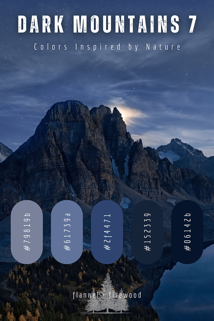 Moving from the heights to the forested slopes, the palette incorporates shades that reflect the nuanced interplay of light and shadow. Pine green and slate gray transport us to the dense forests and rocky outcrops that define the mountain terrain. Pine green whispers of ancient trees rooted in the slopes, while slate gray echoes the rugged cliffs that stand stoic against the night. Together, these colors create a harmonious balance between nature’s raw power and its serene beauty. As the evening deepens, these shades blend seamlessly, offering a tranquil yet imposing atmosphere that captivates the soul.